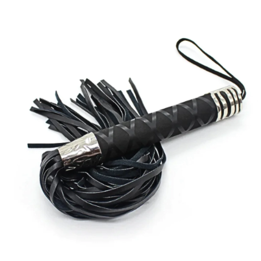 Este látigo o flogger es un accesorio clave en las prácticas de BDSM, diseñado para proporcionar una experiencia de control y juego de roles. Su mango ergonómico antideslizante, de aproximadamente 19 cm, asegura un agarre cómodo y firme durante su uso.